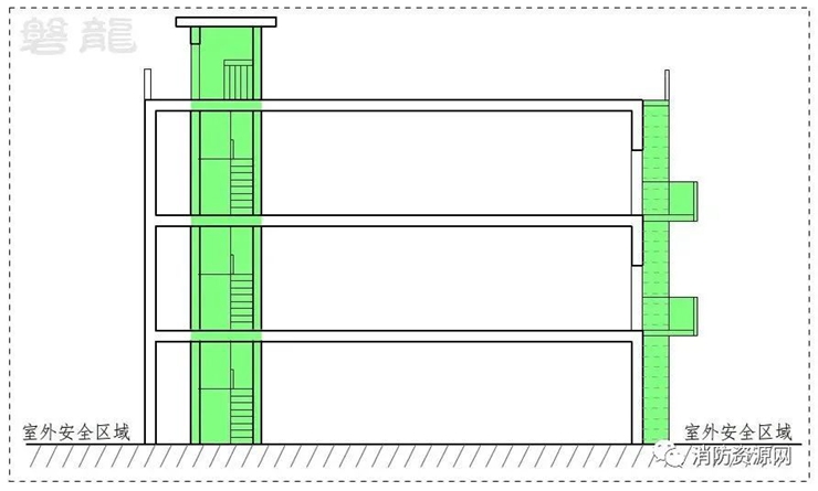 需要說(shuō)明的是,對(duì)于設(shè)置在建筑外墻上的室外疏散樓梯,雖然處于室外區(qū)域,但受制于建筑結(jié)構(gòu)及外墻的耐火極限影響,仍屬于室內(nèi)安全區(qū)域。(圖示3)