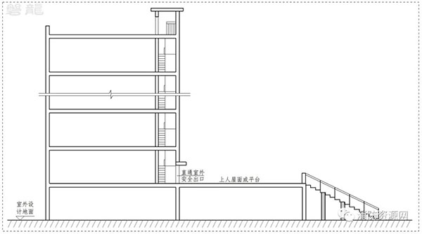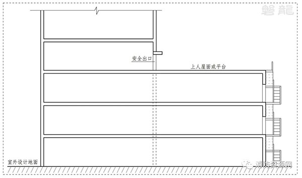1.3 上人屋面或平臺(tái)通過滿足疏散要求的階梯等直達(dá)地面,階梯不受建筑外墻的燃燒性能和耐火極限以及建筑門窗洞口影響。(圖示5)
