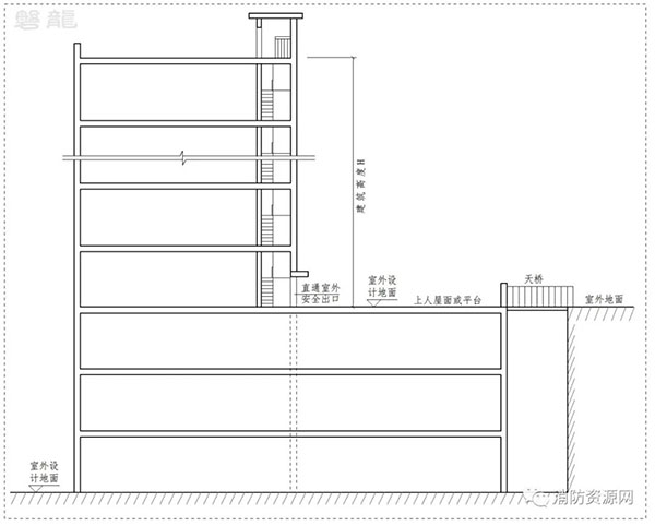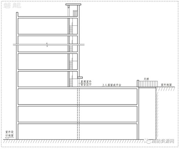1.1 上人屋面或平臺(tái)與地面直接連通,或通過天橋直達(dá)地面(圖示3):