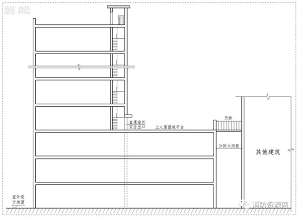 1.2 上人屋面或平臺(tái)通過滿足規(guī)范要求的天橋、連廊直達(dá)其他建筑(圖示4):