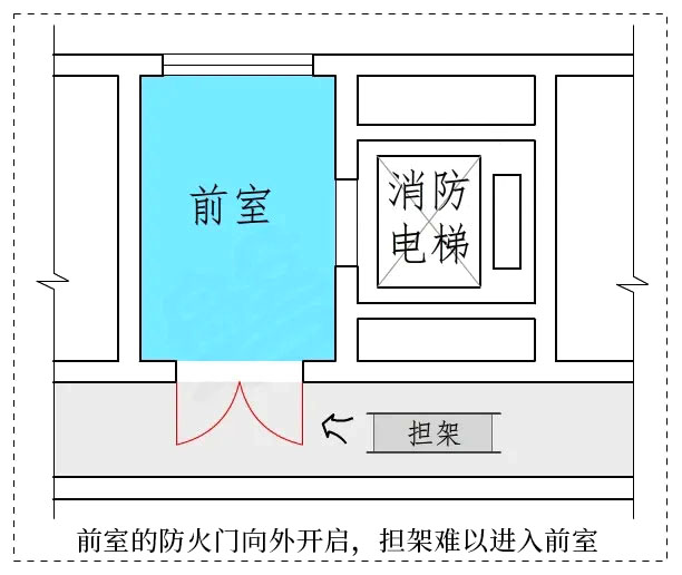 獨立前室的防火門,同樣有疏散需求,主要包括消防員撤離疏散、背負傷員疏散、以及擔架抬負傷員疏散等。因此,消防電梯獨立前室的防火門,同樣應向前室內部開啟,否則可能預埋重大隱患,分解如下: