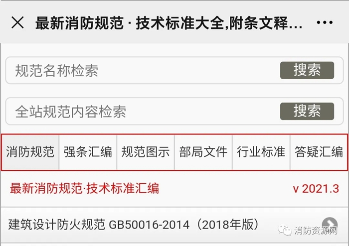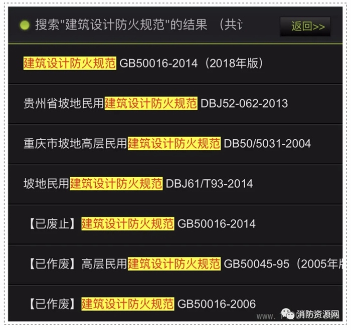 示例:規(guī)范首頁檢索“建筑設(shè)計(jì)防火規(guī)范”,可以檢索到95版(2005)、06版、14版、18版等多個(gè)版本,也有國內(nèi)地方標(biāo)準(zhǔn):