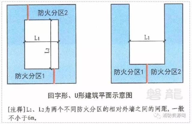五、回字形、U形建筑不同防火分區(qū)的相對(duì)外墻之間的距離,一般不應(yīng)小于6米。(5.2.2圖示10,P75)