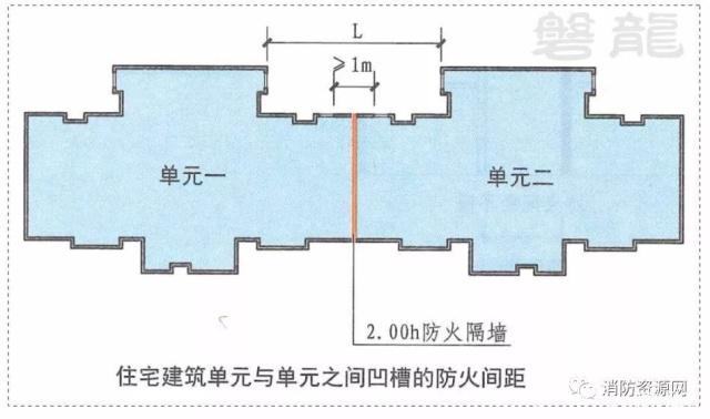 八、住宅建筑單元與單元之間凹槽的防火間距L,一般不小于6m。(5.2.2圖示9,P74)