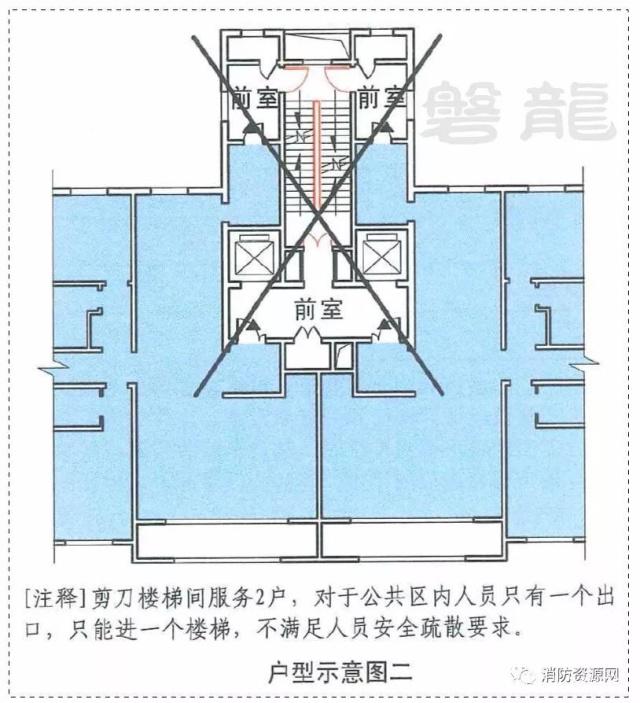 5.5.28圖示2的戶型示意圖三,有違規(guī)范條文5.5.28要求:“兩部剪刀樓梯間共用前室時(shí),進(jìn)入剪刀樓梯間前室的入口應(yīng)該位于不同方位,不能通過同一個(gè)入口進(jìn)入共用前室,入口之間的距離仍要不小于5m”。以此為原則,不應(yīng)該許可。(觀點(diǎn):許可特例應(yīng)協(xié)調(diào)規(guī)范條文,否則容易引發(fā)誤解及衍生極端方案!)