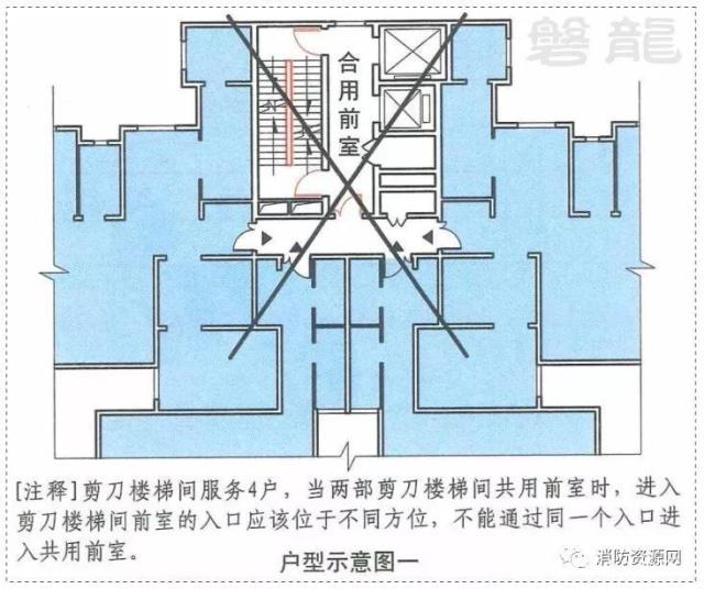 注:新版圖示中,不再限制共用前室內(nèi)兩個(gè)樓梯入口的距離,但仍應(yīng)盡量分開布置