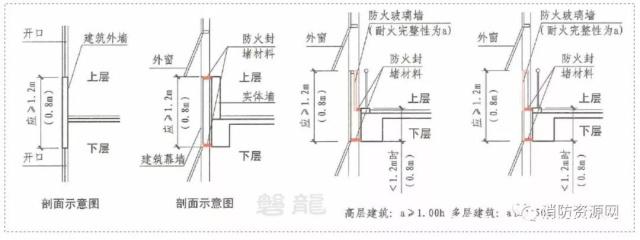 十七、建筑外墻上、下層開口之間設(shè)置實(shí)體墻確有困難時(shí),可設(shè)置防火玻璃墻,原圖示的方案3、方案6在外墻的保護(hù)高度部位形成空隙,新版圖示不再許可。(詳見建規(guī)6.2.5)