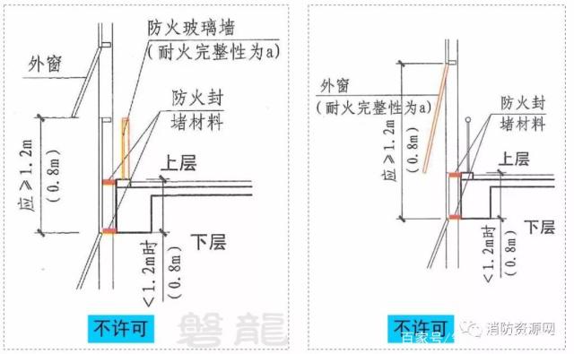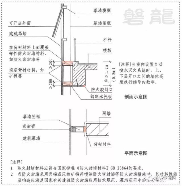 十八、建筑幕墻應(yīng)在每層樓板外沿處采取符合規(guī)范第6.2.5條規(guī)定的防火措施,幕墻與每層樓板、隔墻處的縫隙應(yīng)采用防火封堵材料封堵。新圖示去掉了原圖示中的防火板封堵材料,增加了封堵材料的厚度要求等。(6.2.6圖示)