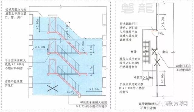 十九、室外疏散樓梯開門位置的首層對(duì)應(yīng)部位,不應(yīng)設(shè)置其他門(也不能是疏散門)。同時(shí),圖示明確了室外疏散樓梯周圍門窗洞口的距離要求。(6.4.5圖示,P177)