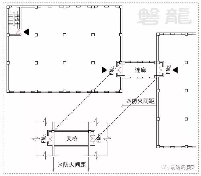 二十二、天橋、連廊與建筑物的連接部位應(yīng)設(shè)置防火門,防火門應(yīng)向天橋(連廊)方向開啟。(6.6.4圖示1,P187)