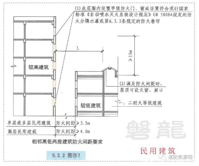 二十三、相鄰兩座建筑符合減少防火間距的以下情況,較高建筑外墻到較低建筑屋頂?shù)奶齑啊⒍纯诘乃骄嚯xL,應(yīng)滿足正常防火間距要求。(民用建筑詳見5.2.2圖示6,P73)、(廠房詳見3.4.5圖示3,P33)、(倉庫詳見3.5.3圖示3,P40)
