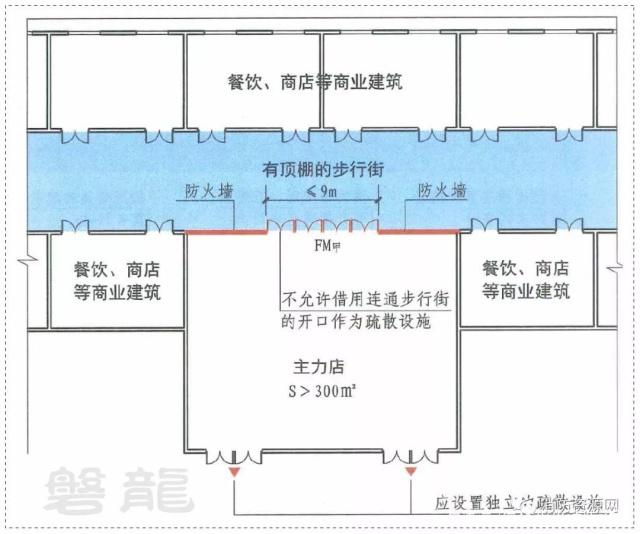 二十五、新圖示明確了《公消[2016]113號(hào)》要求:對(duì)于利用建筑內(nèi)部有頂棚的步行街進(jìn)行安全疏散的超大城市綜合體,步行街兩側(cè)的主力店應(yīng)采用防火墻與步行街之間進(jìn)行分隔,連通步行街開口部位寬度不應(yīng)大于9m,主力店應(yīng)設(shè)置獨(dú)立的疏散設(shè)施,不允許借用連通步行街的開口,步行街首層與地下層之間不應(yīng)設(shè)置中庭、自動(dòng)扶梯等上下連通的開口。(5.3.6圖示3,P87)