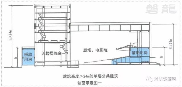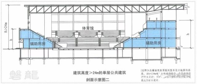 二十七、體育館、劇場、電影院等高大空間單層公共建筑,當(dāng)輔助用房頂板到室外設(shè)計(jì)地面的高度≤24m時(shí),整體建筑按單、多層建筑進(jìn)行防火設(shè)計(jì);當(dāng)輔助用房頂板到室外設(shè)計(jì)地面的高度>24m時(shí),整體建筑按高層建筑進(jìn)行防火設(shè)計(jì)。(5.1.1圖示8、圖示9,P67)
