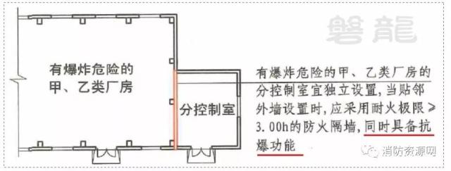 二十九、有爆炸危險(xiǎn)的甲、乙類廠房的分控制室宜獨(dú)立設(shè)置,當(dāng)貼鄰?fù)鈮υO(shè)置時(shí),應(yīng)采用耐火極限≥3.00h的防火隔墻,同時(shí)具備抗爆功能。(3.6.9,圖示P45)