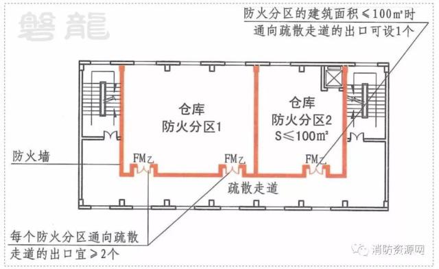 三十一、進(jìn)一步明確了倉庫安全出口的設(shè)置要求,倉庫建筑中,不同防火分區(qū)共用的疏散樓梯,疏散樓梯不應(yīng)設(shè)置在防火分區(qū)內(nèi),與防火分區(qū)之間應(yīng)采用防火墻分隔。(3.8.2圖示3,P50)