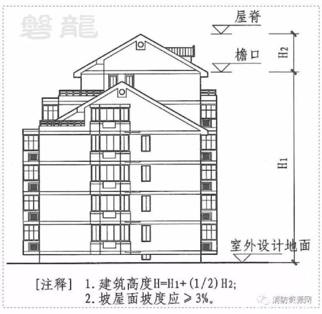 三十四、在確定坡屋面建筑的建筑高度時(shí),要求屋面坡度≥3%,否則按平屋面處理。(附錄A.0.1圖示1,P246)