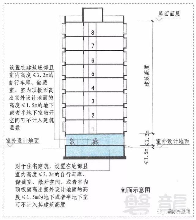 對(duì)于住宅建筑:設(shè)置在底部且室內(nèi)高度≤2.2m的自行車庫、儲(chǔ)藏室、敞開空間,可不計(jì)入其建筑高度;室內(nèi)頂板面高出室外設(shè)計(jì)地面的高度≤1.5m的地下或者半地下室可不計(jì)入其建筑高度。(附錄A.0.2圖示3,P248)