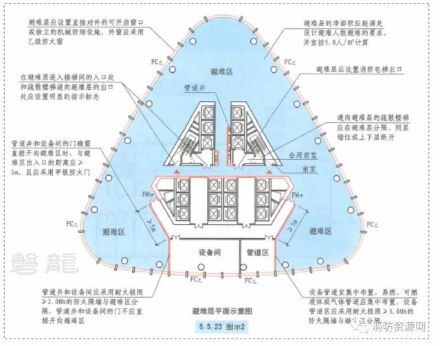 四十、避難層的其他房間,除設(shè)備間和管道區(qū)外,不允許設(shè)置為其他功能房間。(5.5.23,圖示2)