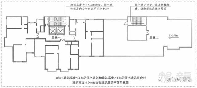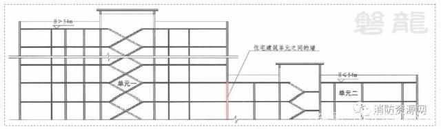 爭議:規(guī)范5.5.25至5.5.28所述的安全出口數(shù)量,均以建筑為單位,并不以建筑的某個(gè)單元為單位,因此有觀點(diǎn)認(rèn)為,圖示建筑采用單元隔墻,應(yīng)歸屬于同一棟建筑,同一建筑中的安全出口數(shù)量應(yīng)一致。至少,圖示注釋中的“應(yīng)”字不妥,改為“可”更宜,即:“建筑高度不同的住宅建筑拼合時(shí),各單元的樓梯數(shù)量可根據(jù)各單元的建筑高度分別確定”。