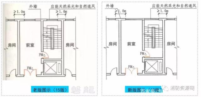 三、前室和樓梯間的門、窗、洞口間距,不再強(qiáng)調(diào)1.0m的距離要求。(6.4.1圖示1,P172)