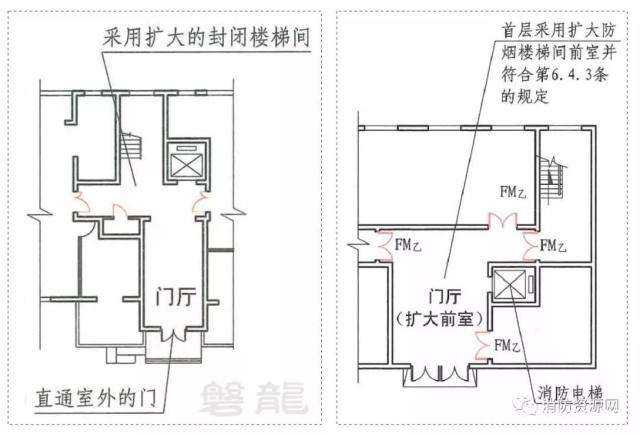 四、首層擴(kuò)大封閉樓梯間和擴(kuò)大防煙樓梯間前室,不再強(qiáng)調(diào)疏散距離要求。(5.5.29圖示5)