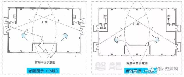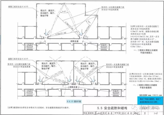 十一、根據(jù)5.5.17圖示7,觀眾廳、展覽廳、多功能廳、餐廳、營業(yè)廳、開敞式辦公區(qū)等的最大疏散距離與“室內(nèi)任意一點(diǎn)與兩個(gè)疏散門的連線夾角”相關(guān),實(shí)際應(yīng)用中,存在諸多不確定因素,與實(shí)際應(yīng)用不符,尤其對(duì)于開敞式辦公區(qū)等火災(zāi)危險(xiǎn)性較低的場所,也過于苛刻!(5.5.17圖示7)