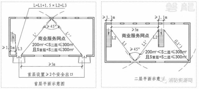 十、一定情況下的商業(yè)服務(wù)網(wǎng)點(diǎn),除應(yīng)滿足相鄰兩個(gè)安全出口的距離要求外,最遠(yuǎn)點(diǎn)與2個(gè)安全出口還需要滿足一定的連線夾角要求,房間進(jìn)深與兩個(gè)安全出口的水平距離相關(guān)。(具體以5.4.11圖示為準(zhǔn),P102)