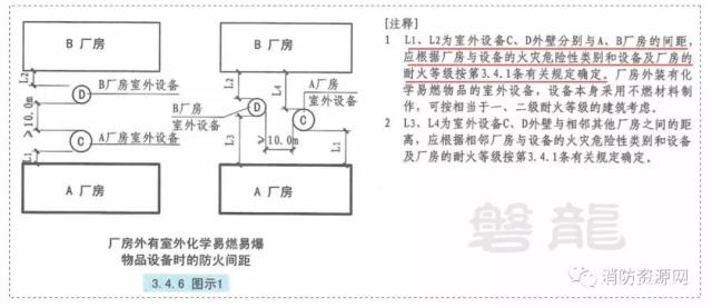 十三、室外設(shè)備外壁與所屬廠房的間距,3.4.6圖示1要求”根據(jù)廠房與設(shè)備的火災(zāi)危險(xiǎn)性類別和設(shè)備及廠房的耐火等級(jí)按第3.4.1條有關(guān)規(guī)定確定“,與3.4.6條文說明不符:“化學(xué)易燃物品的室外設(shè)備與所屬廠房的間距,主要按工藝要求確定,本規(guī)范不作要求”。
