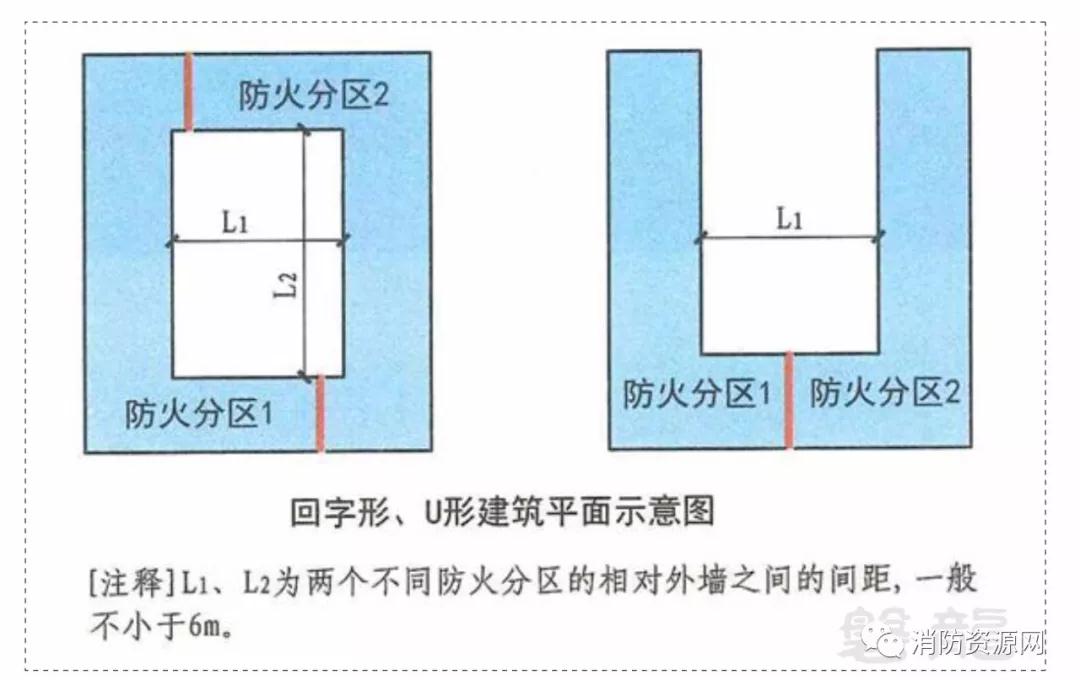 二、對(duì)于需要采用防火墻分隔的兩個(gè)區(qū)域,互為迎火面的門(mén)窗洞口,通常需要保證6m的防火間距,互為側(cè)火面的門(mén)窗洞口,通常只需要保證2m的防火間距。1、示例5的U形建筑,L1≥6m,L≥2m。