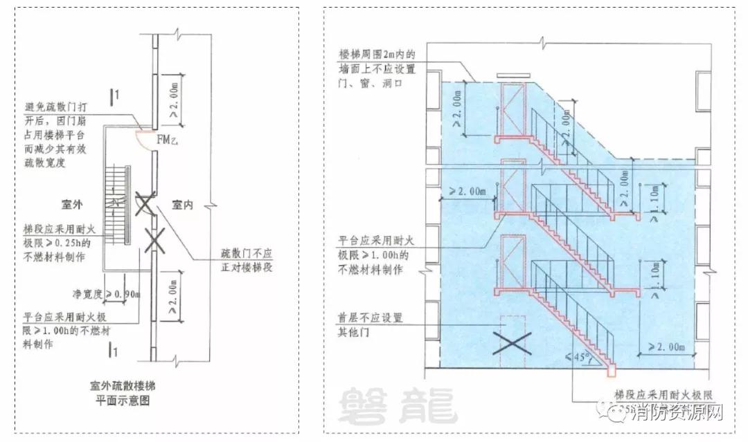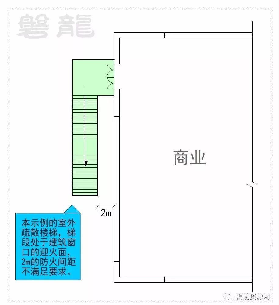 2、錯(cuò)誤示例:示例10中,室外樓梯雖然離門(mén)窗洞口有2m的距離,但因?yàn)榕c洞口構(gòu)成迎火面,直接受火焰直射和輻射的影響,安全無(wú)法保證。
