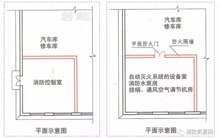 1、屬于民用建筑的地下或半地下設(shè)備用房,或主要用于民用建筑的設(shè)備用房,應(yīng)執(zhí)行《建筑設(shè)計(jì)防火規(guī)范》,設(shè)備用房的防火分區(qū)最大允許建筑面積不應(yīng)大于1000㎡(設(shè)置自動(dòng)滅火系統(tǒng)時(shí)不大于2000㎡)。2、地下汽車庫(kù)適應(yīng)《汽車庫(kù)、修車庫(kù)、停車場(chǎng)設(shè)計(jì)防火規(guī)范》,防火分區(qū)最大允許建筑面積不應(yīng)大于2000㎡(設(shè)置自動(dòng)滅火系統(tǒng)時(shí)不大于4000㎡)。由上可知,地下汽車庫(kù)的防火分區(qū)面積較民用建筑的地下設(shè)備用房整整大了一倍,如交叉設(shè)置必然造成混亂,因此民用建筑的設(shè)備用房不應(yīng)劃入汽車庫(kù)防火分區(qū)。注:對(duì)于僅供汽車庫(kù)使用或主要供汽車庫(kù)使用的附屬設(shè)備用房,可以和汽車庫(kù)劃為同一防火分區(qū)。二、民用建筑的設(shè)備用房,不應(yīng)向汽車庫(kù)開(kāi)設(shè)疏散門(mén)或安全出口。1、汽車庫(kù)的安全疏散距離相對(duì)寬松:“汽車庫(kù)室內(nèi)任一點(diǎn)至最近人員安全出口的疏散距離不應(yīng)大于45m,當(dāng)設(shè)置自動(dòng)滅火系統(tǒng)時(shí),其距離不應(yīng)大于60m(6.0.6)”,汽車庫(kù)的安全疏散和民用建筑部分不應(yīng)混雜。2、汽車庫(kù)規(guī)范已明確“防火墻上通向相鄰防火分區(qū)的甲級(jí)防火門(mén),不得作為第二安全出口(6.0.2)”,也就是說(shuō)“汽車庫(kù)的防火分區(qū)不得借用相鄰防火分區(qū)的安全出口”。綜上,既然汽車庫(kù)自屬的防火分區(qū)之間都不能借用安全出口,當(dāng)然更不會(huì)允許民用建筑用房向汽車庫(kù)開(kāi)設(shè)疏散門(mén)或借用安全出口。依此,民用建筑的設(shè)備用房,不應(yīng)向汽車庫(kù)開(kāi)設(shè)疏散門(mén)或安全出口。三、附設(shè)在汽車庫(kù)、修車庫(kù)內(nèi),且主要為其服務(wù)的消防控制室、自動(dòng)滅火系統(tǒng)的設(shè)備室、消防水泵房和排煙、通風(fēng)空氣調(diào)節(jié)機(jī)房等,應(yīng)采用防火隔墻和耐火極限不低于1.50h的不燃性樓板相互隔開(kāi)或與相鄰部位分隔,部分設(shè)備室的疏散門(mén)可以向汽車庫(kù)或修車庫(kù)開(kāi)啟,詳見(jiàn)圖示1。