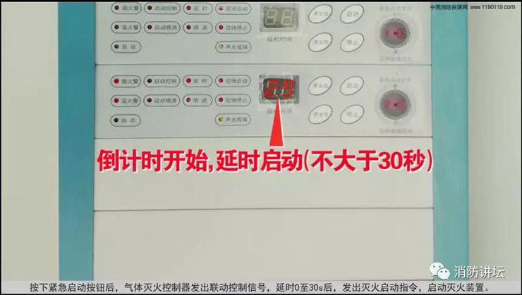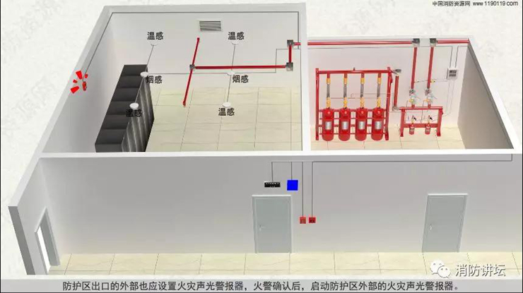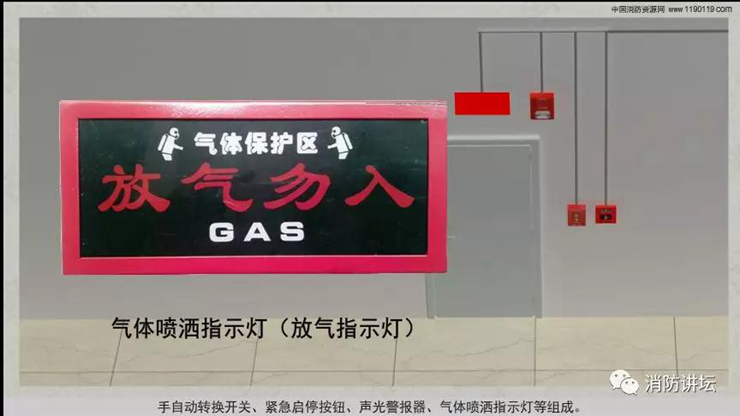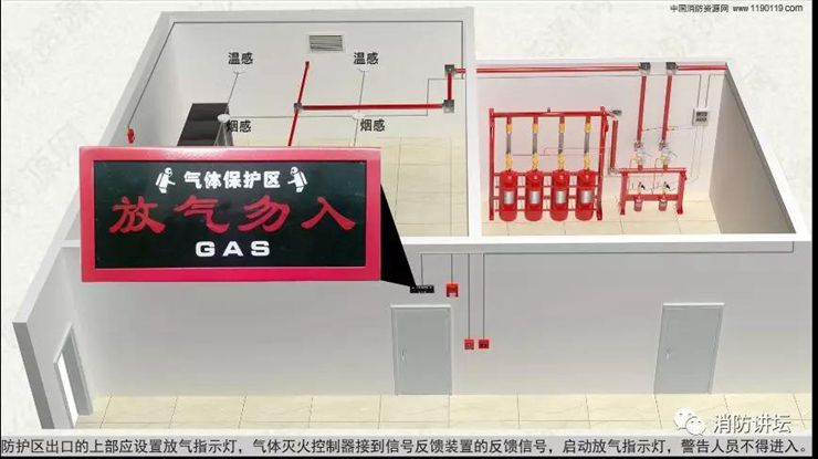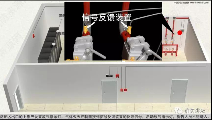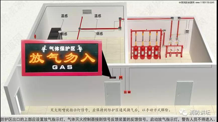 三、規(guī)范要求采用帶聲報警的放氣指示燈,但實(shí)際中都是采用“聲光警報器+放氣指示燈”的方式,為方便人員撤離且防止人員在延時時段進(jìn)入防護(hù)區(qū),一般設(shè)定聲光警報器和噴放延時同時啟動(即和聯(lián)動關(guān)閉排風(fēng)機(jī)、防火閥、空氣調(diào)節(jié)系統(tǒng)、啟動防護(hù)區(qū)域開口封閉裝置等同時啟動),放氣指示燈需要接收噴放反饋信號才啟動。