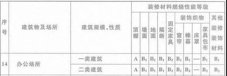 二、辦公建筑內(nèi)部各部位裝修材料的燃燒性能等級(jí),不應(yīng)低于下列規(guī)定: