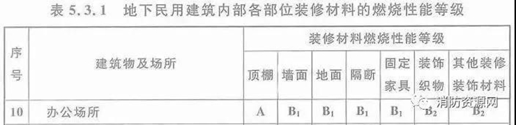 3、地下辦公建筑內(nèi)部各部位裝修材料的燃燒性能等級(jí),不應(yīng)低于下表規(guī)定。(5.3.1)