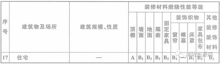 二、單層、多層住宅建筑內(nèi)部各部位裝修材料的燃燒性能等級(jí),不應(yīng)低于下表規(guī)定。(5.1.1)