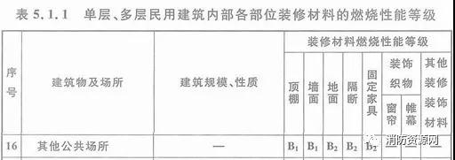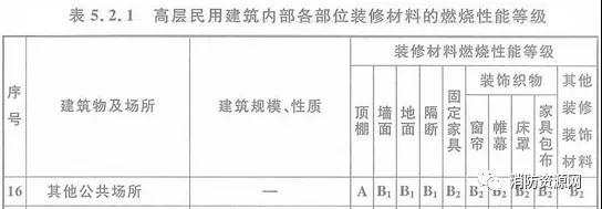 2、高層宿舍建筑內(nèi)部各部位裝修材料的燃燒性能等級,不應低于《建筑內(nèi)部裝修設(shè)計防火規(guī)范》5.2.1規(guī)定: