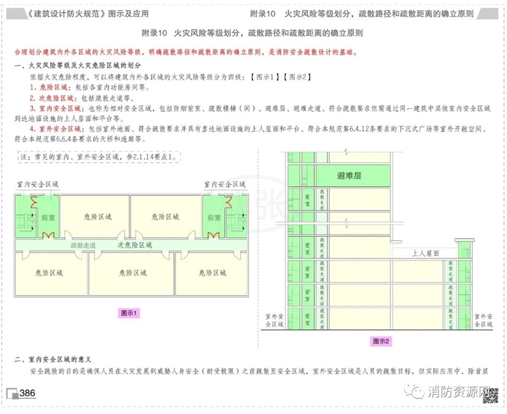 3. 室內(nèi)安全區(qū)域:也稱為相對安全區(qū)域,包括防煙前室、疏散樓梯(間)、避難層、避難走道、符合疏散要求但需通過同一建筑中其他室內(nèi)安全區(qū)域到達地面設(shè)施的上人屋面和平臺等。