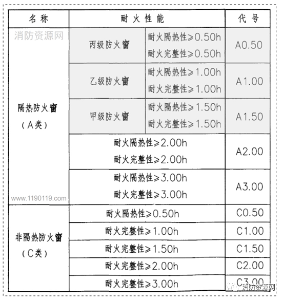 1、按耐火性能劃分,防火窗的分類及代號見下表: